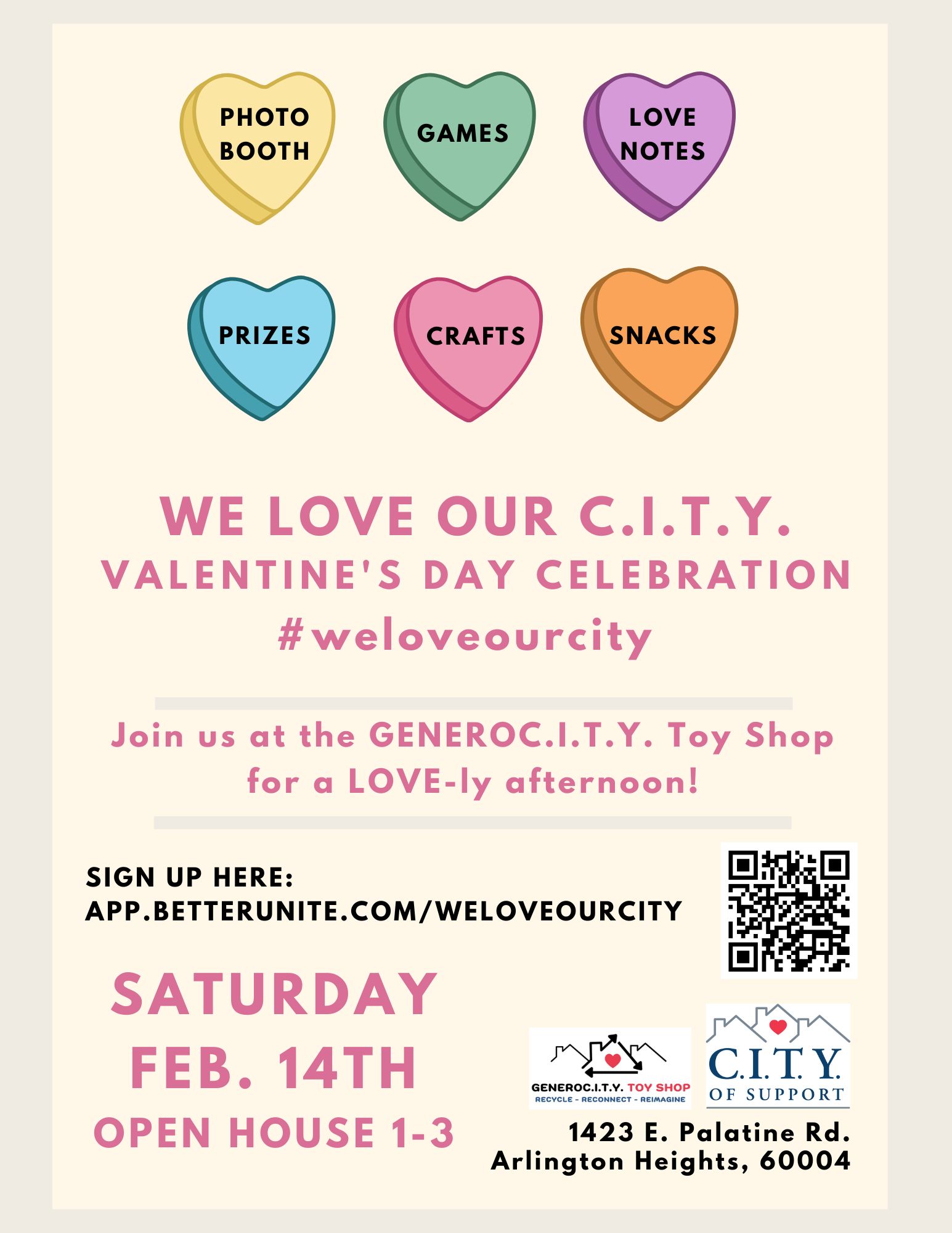 Stop by for a LOVE-ly afternoon at the GENEROC.I.T.Y. Toy Shop as we celebrate Valentine's Day! This free open-house event includes: Games Prizes Crafts Snacks and more! Please register here to help us plan: https://app.betterunite.com/weloveourcity Stop by our shop and help us spread the love! #weloveourcity |