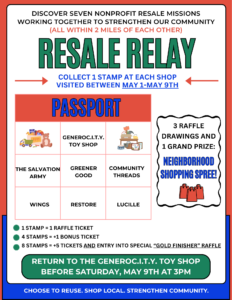 Pick up your relay “passport” at any of the participating shops between May 1st-May 9th, and bring it with you to get stamped at each of the different shops. Whether you visit one or all, be sure to drop off your passport no later than 3:00pm on Saturday, May 9th at the GENEROC.I.T.Y. Toy Shop.